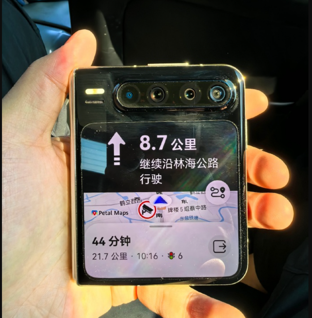 而在陌生城市的街头,通过外屏操作花瓣地图,能够实时显示转弯、距离等关键导航信息。只需轻瞥一眼,路线信息清晰可见,走走停停的路上再也不用担心错过拐弯。尤其是骑行观光的时候,不用一直展开大屏举着手机,安全又省心。