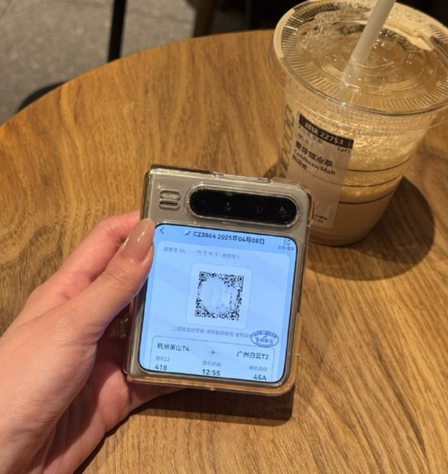 在机场,航旅纵横在华为Pura X外屏上的表现更是惊艳。通过它的外屏万能卡片,你可以实时查看日期、航班信息、登机口变更和起落时间等关键信息。登机的时候,更可以直接在外屏一点,优雅出示电子登机牌。